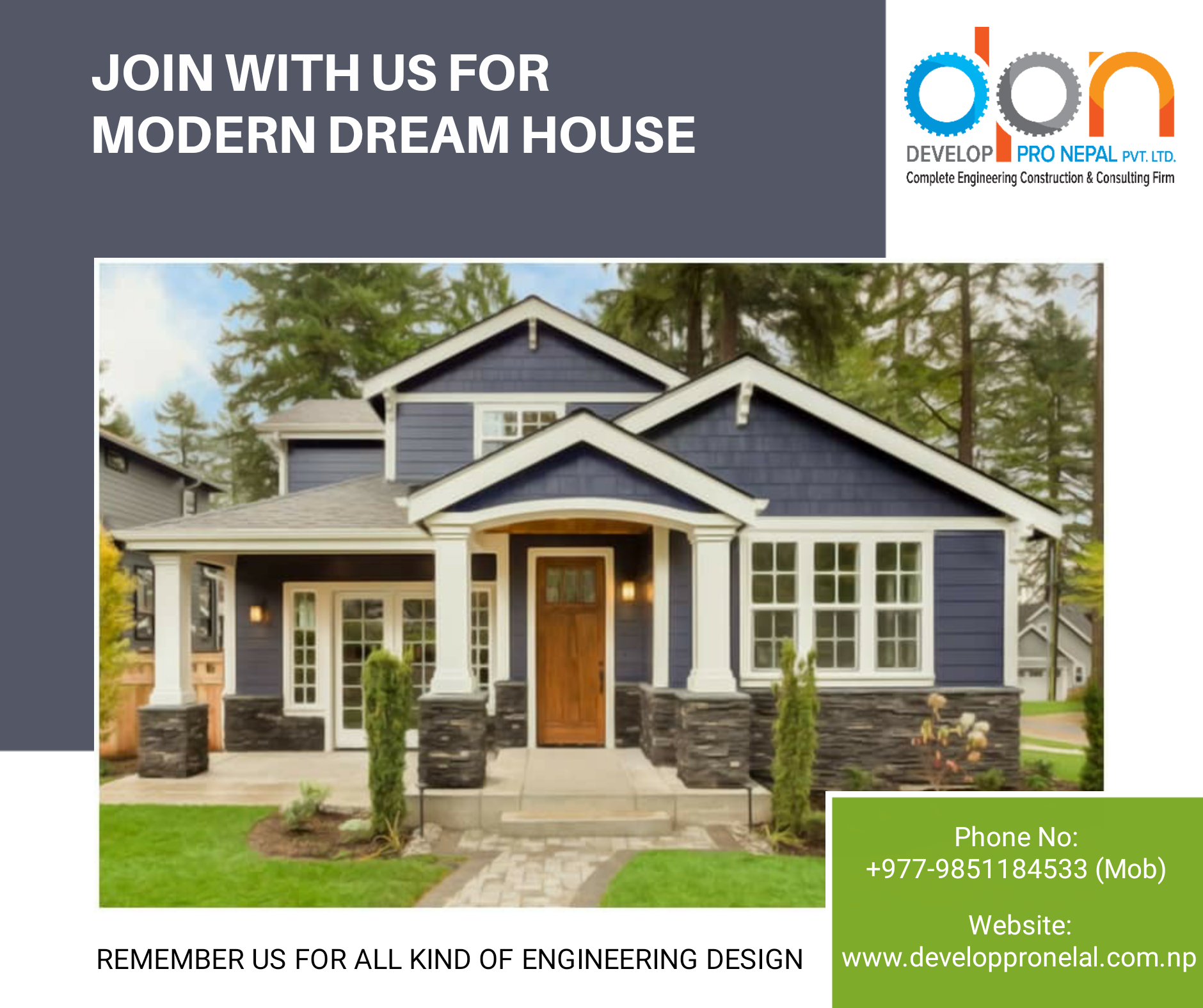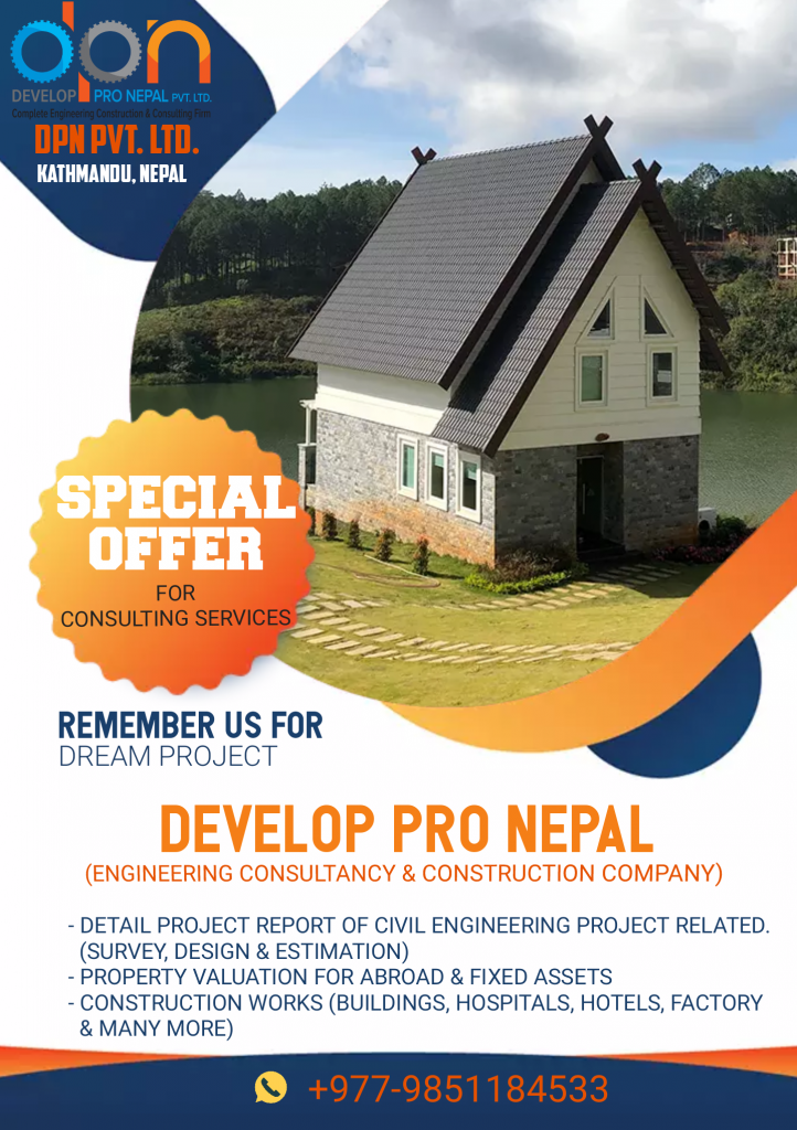 Develop Pro Nepal (Pvt.) Ltd. (DPN in Short Form) is a private organization established in February, 2016 A.D. with the prime aim of contributing in sustainable national development. It is registered under company act of Nepal. The Major fields that DPN interested and capable of delivering its’s services are Planner, builders, property valuation, transportation, water supply, irrigation, hydro power, construction, information technology and many more.